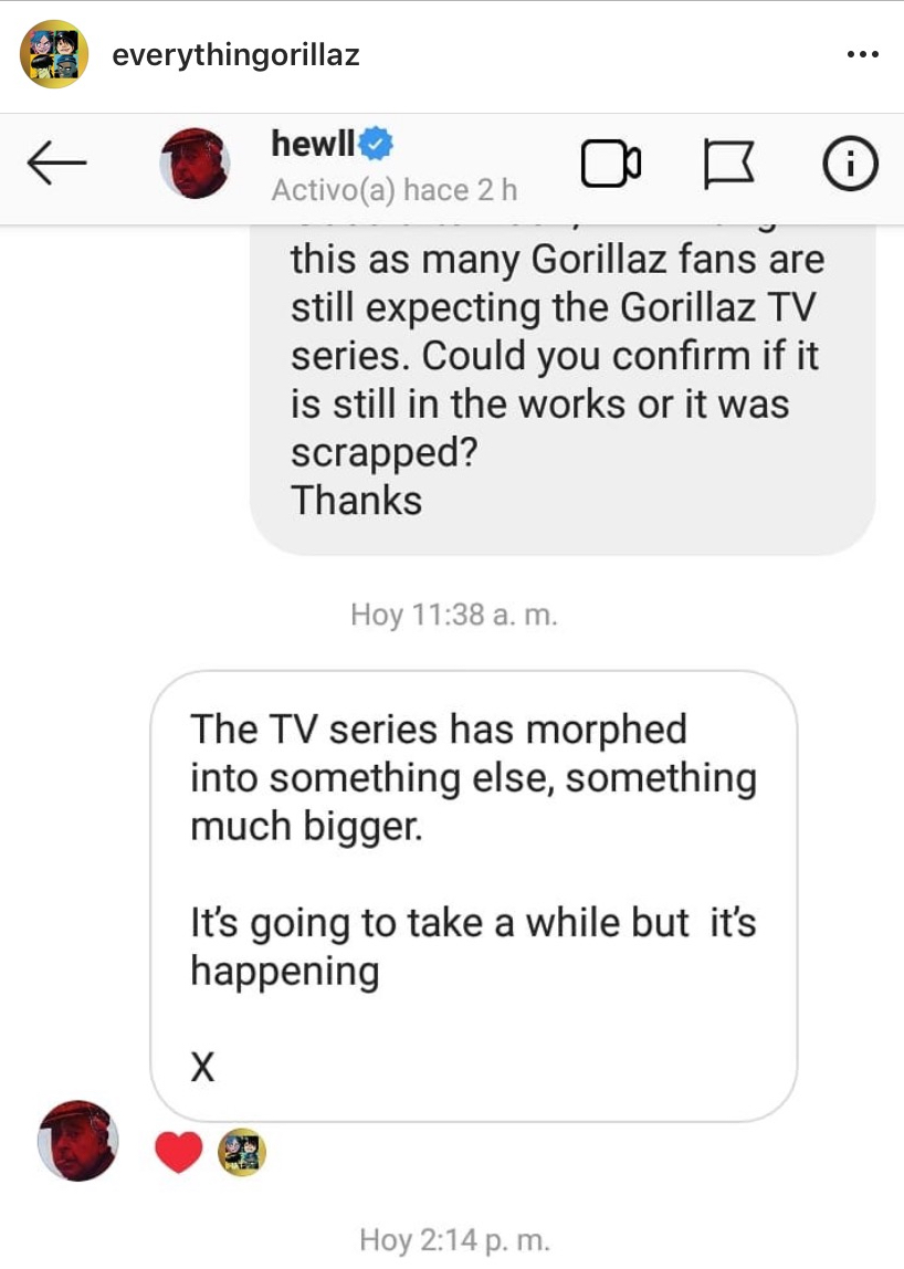 Last Monday, the EverythinGorillaz account broke the news that they had briefly chatted to Jamie Hewlett about the future of Gorillaz. They posted the following screenshot: