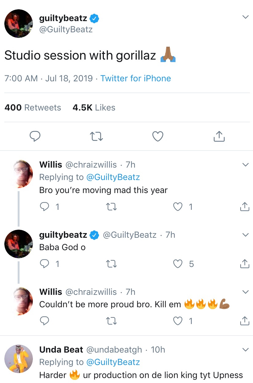 The fandom exploded when we learned that Ghanaian producer Guilty Beatz was in the studio with Gorillaz. He tweeted it out on Thursday: