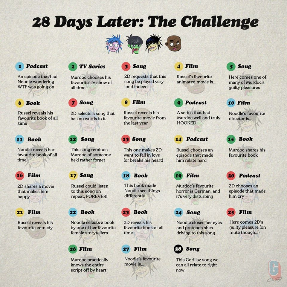 1 day after the group’s announcement, an event known as the “28 Day Challenge” began, giving members a series of daily media recommendations from the band. So far, we’re on day 3 and all the things Gorillaz have linked can be seen below. It’s also being speculated that day 28 will be Episode 4 of Song Machine, something we’ll find out when the time eventually comes…
